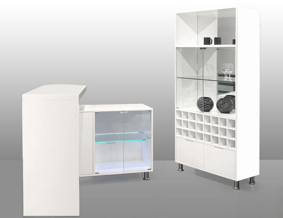 The Basel Bar Counter and Wall are a one of a kind set that is perfect for entertaining. The set is highlighted by LED lights. The bar wall can be used as a curio and features a clear mirror back, 2 glass doors with a glass shelf, a wine rack and two drawers. The bar counter has a counter top that can be rotated 360 degrees on wheels – so it can be stored flush with the case or pulled out to entertain. The case features a curved door with a center shelf and two glass doors with a glass shelf. This bar set is the perfect entertainment set for any modern home.