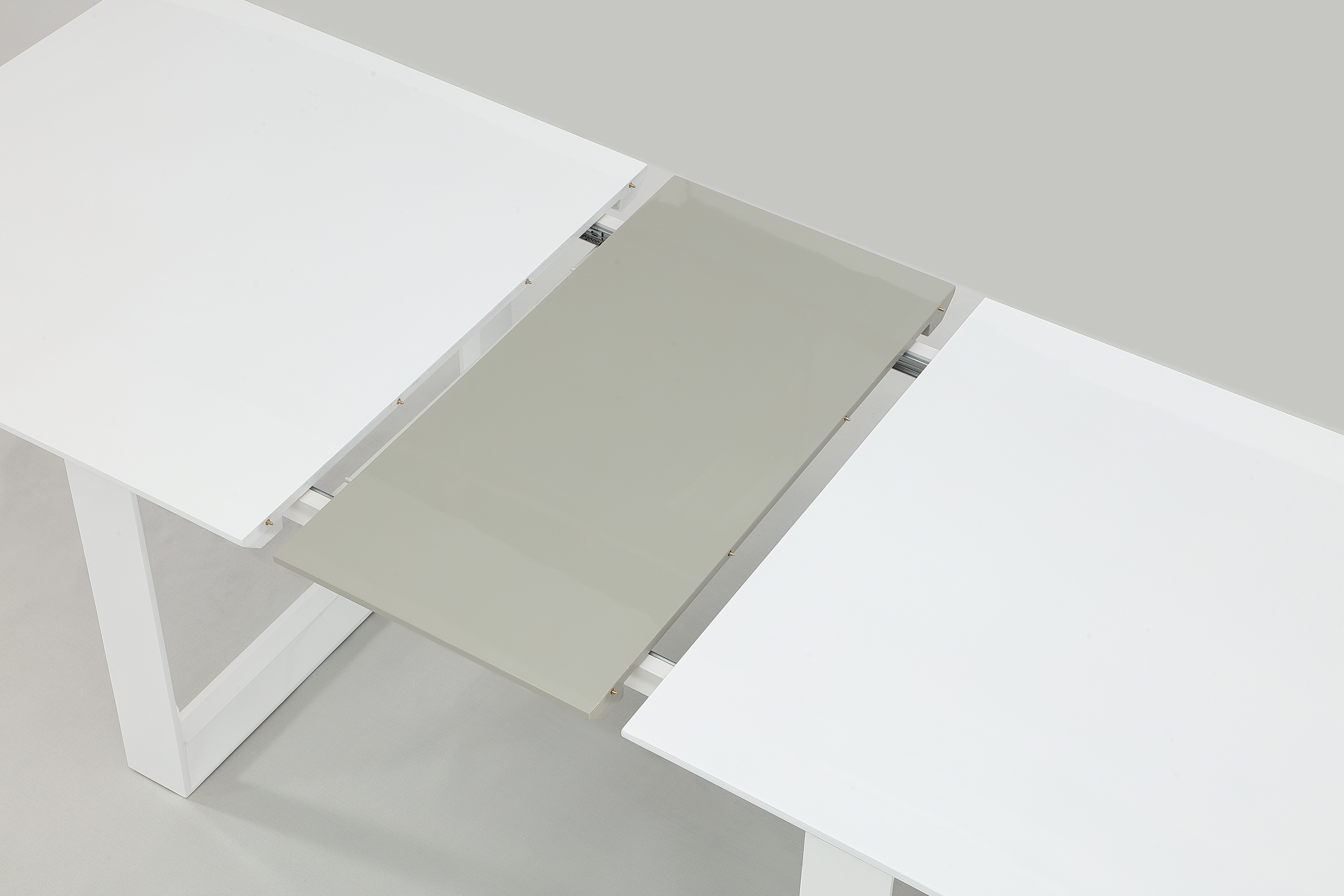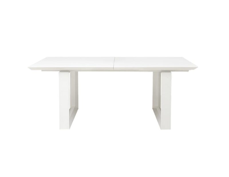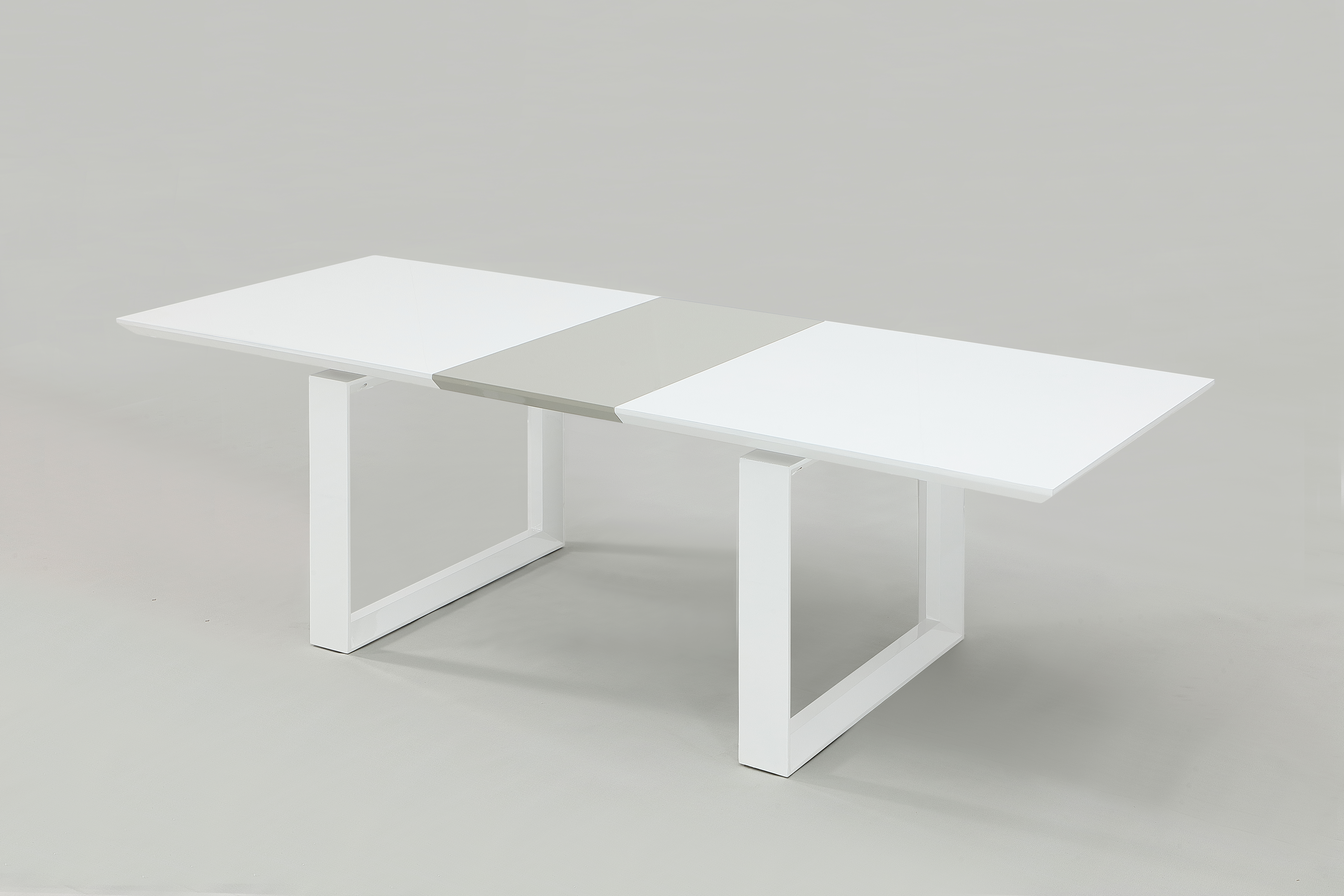 The Natalia White Lacquer Dining Table is a rectangular table with a white lacquer finish. Resting on two square-shaped legs, this contemporary dining table is extendable to entertain guests or large families. The extension is a light gray lacquer for a beautiful contrast and accent.